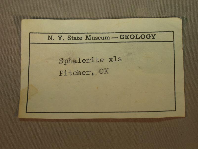 New York State Museum- Geology label. Many gemmy orange red small crystals dot the matrix.