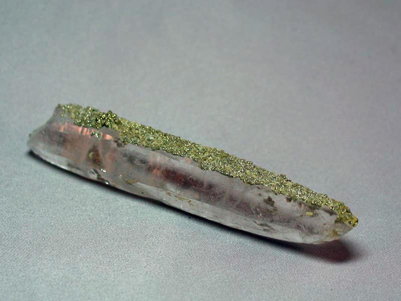 Gemmy tapered single Quartz with selected faces coated by Pyrite. Multiple faceted termination.