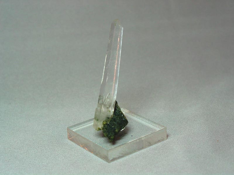 A nice miniature, flawless 2” clear Quartz crystal perched on green Andradite Garnet.